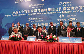 - La signature de cet accord a été organisée à Pékin en présence de Lin Zuoming, président de la société AVIC, de Jean-Paul Herteman, président du Directoire de Safran, Marc Ventre, directeur-général adjoint de la branche Propulsion aéronautique et spatiale, et de MA Fuan, président de AVIC Engine.