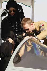 Des femmes émiriennes visitent le cockpit d'un Rafale sur le statique.