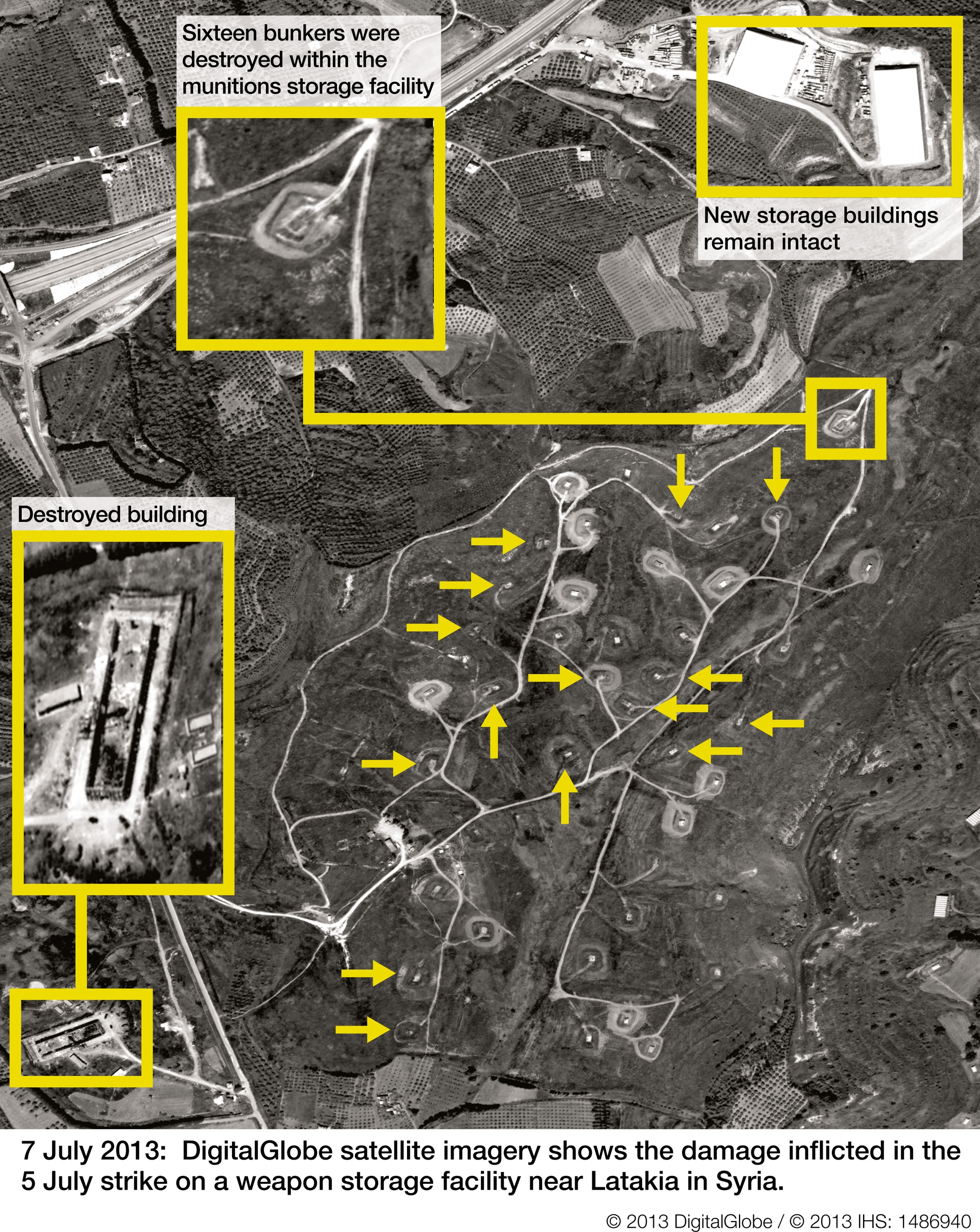 L’attaque du 5 juillet 2013 sur un dépôt de munitions près de Lattaquié en Syrie était beaucoup plus vaste qu’on ne le pensait selon une imagerie satellite du groupe IHS, ce qui suggère qu’elle n’a pas été lancée depuis un sous-marin comme le prétendaient certaines sources.