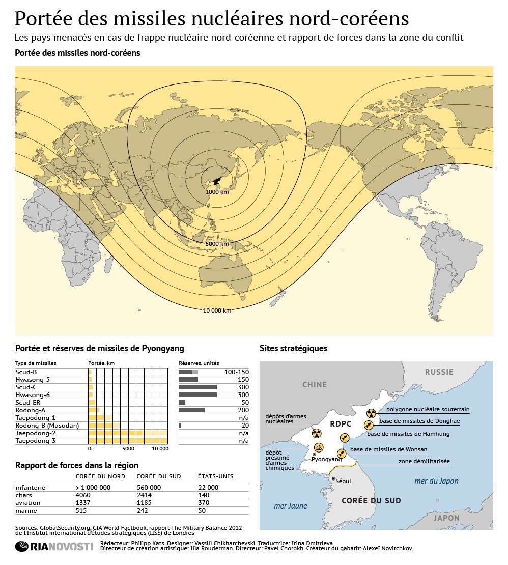 On ignore par ailleurs la portée réelle des missiles nord-coréens qui pourraient frapper théoriquement l’ouest des États-Unis et l’Europe grâce à son missile Taepodong-3 d’une portée de 10 000 km selon des agences occidentales. Mais une fois lancés, les missiles seraient immédiatement détectées et interceptés par les États-Unis qui déclencheraient des représailles massives.