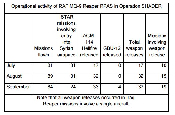 Le Royaume-Uni a commencé ses opérations de combat sur la Syrie le 2 décembre 2015. Mais dans sa réponse au Parlement, le gouvernement a expliqué que le MQ-9 Reaper britannique assurait des missions ISR (renseignement, surveillance et reconnaissance) sur la Syrie et l’Irak depuis la fin de l’année 2014.