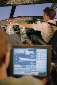 Pilote et instructeur dans un simulateur de vol Airbus à Roissy (photo : Ph. delafosse)