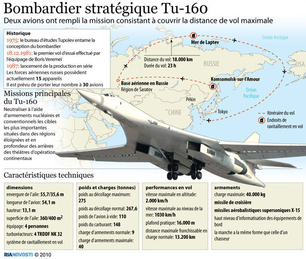 Deux bombardiers porte-engins stratégiques Tupolev Tu-160 (« Blackjacks ») ont rempli « avec succès » une mission consistant à effectuer un vol de distance, a annoncé le porte-parole de l’armée de l’air russe le lieutenant-colonel Vladimir Drik.