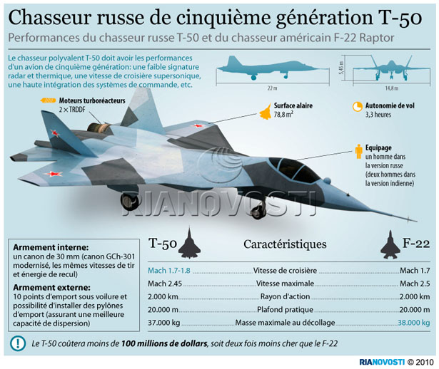 Après avoir rappelé que le T-50 coûterait 2,5 à 3 fois moins cher que le F-22 américain, M.Poutine a fait savoir que le chasseur russe « le surpasserait également pour la manœuvrabilité, les armements de bord et la distance de vol ».