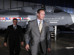 Peter MacKay (à droite) en compagnie de Tony Clement devant un avion F-35.