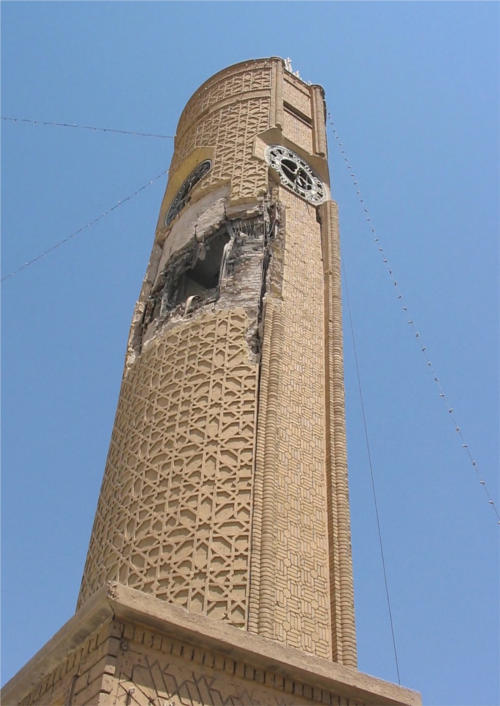 « Le tour de l’horloge [photo à droite] dominait un marché très encombré. Un tireur d’élite y était caché, et tirait sur les gens (sur des civils ou des GI). Quelqu’un sur le terrain a demandé un soutien aérien, et un Harrier armé d’un LG Maverick est arrivé sur les lieux. Comme vous pouvez le voir, le Maverick a fait un travail de précision de première classe en pulvérisant le nid du sniper, tout en laissant intacte la structure environnante et en minimisant les dommages collatéraux. »